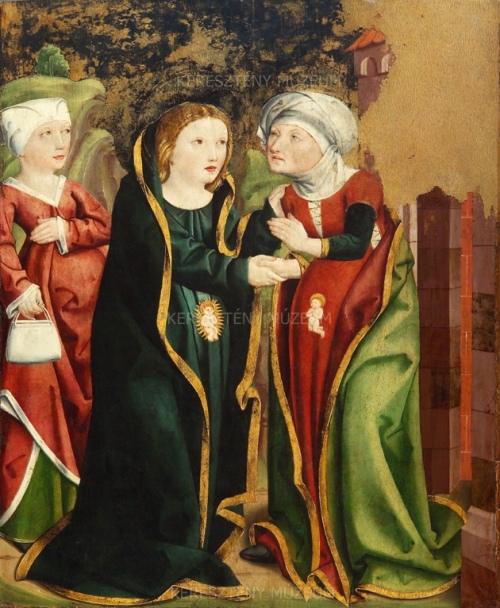 This panel showing the meeting of Mary and Elizabeth was once in the village of Csegöld in Szatmár County in East Hungary. It was probably painted in the last years of the 15th century, and its style is close to the works created in Upper Hungary. In the company of a servant, the expectant Virgin visits her relative, Elizabeth, who is also with child. This is a frequently represented scene of the Virgin’s life, following the Annunciation. It is unusual, however, that the unborn babies are painted on the exterior of their mothers’ wombs. The Christ child turns with a blessing gesture towards the little Saint John the Baptist who is kneeling in adoration. There is significant loss in the painted surface in the upper right corner. It was not possible to reconstruct it during restoration, as it is not clear what sort of architectural elements originally appeared in the background.